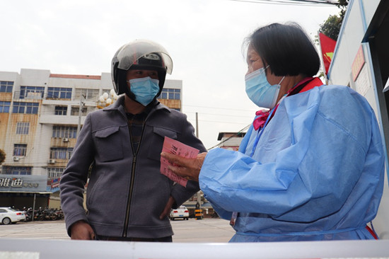 涂岭村八旬党员陈秀琴坚守卡口,检查通行证并做好登记。周益艺摄