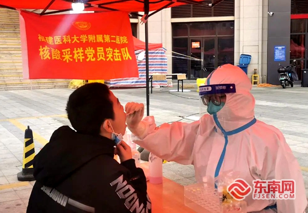 分赴泉州各地“战疫”的福医二院核酸采样党员突击队。福医二院 供图 党员向前冲,吹响“红色集结号” “一个党员就是一面旗帜,一个支部就是一座堡垒。”福医二院党委书记曾奕明强调,疫情突发的特殊时刻,党员干部必须冲锋在前。 “我是党员,我先上!”“疫情在哪里,我们就要战斗在哪里!”医院各党支部迅速组建了20余支党员突击队,积极参与到预检分诊、发热门诊、核酸采样、核酸检测、医疗救治、院感防控、宣传引导、后勤保障等工作,全面充实一线疫情防控红色力量。 核酸采样党员突击队是最早一批投入“战斗”的党员突击队之一。3月13日晚,大规模核酸采样号角吹起,医护人员闻令而动,纷纷请战,当晚就集结207人到泉州市区各个采样点为社区采样。随着疫情形势的严峻,医院又陆续增派数百名医护人员分赴泉州各地核酸采样。党员医护人员率先垂范,完成了一项又一项的采样任务。疫情高发期,几乎每天一轮核酸检测。时间紧任务重,他们没有丝毫犹豫,或披星戴月,或风雨兼程,无惧烈日和暴雨,深入一线,全力做好疫情防控“排头兵”。 核酸采样党员突击队里活跃着一群熟悉的身影,她们是90后、95后,却是实实在在的核酸采样队“老兵”。医院发出征集令后,党员林惠燕第一时间报名。近日,她通过小区喇叭喊出的“不要贴贴,贴贴变密接”等魔性口号广为人知,编创的“大话西游”式台词和“核酸舞”从网络平台传开热度,她希望以这样的方式吸引更多的人自觉地来做核酸检测。 在福医二院,PCR实验室和两座方舱实验室紧张而忙碌,2支核酸检测党员突击队日以继夜,一丝不苟完成院内外的核酸检测任务。东海检验科核酸检测实验室党员突击队长、行政副主任黄荣富所率领的检测团队是一群距离新冠病毒最近的人,仿佛冲锋在抗疫战场上的“侦察兵”,身着密不透风的防护服,24小时轮班工作,争分夺秒与病毒赛跑。黄荣富坦言“压力山大”:“越是任务重的时候,越是需要我带头的时候!”责任感和使命感让他充满信心和力量。 |