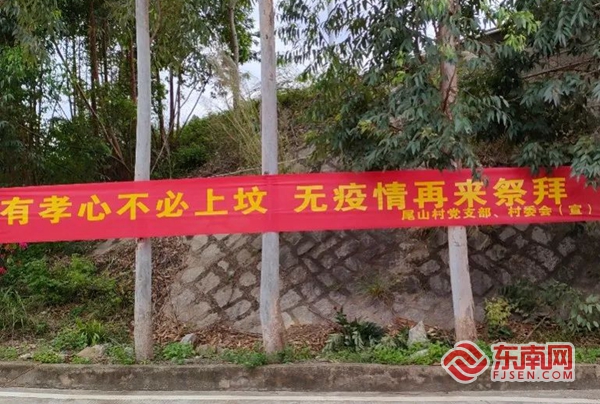 主要村干道布置宣传标语。紫山镇 供图 线上+线下宣传 线上通过“紫山镇人民政府”微信公众号发出《致紫山镇在外乡亲的一封信》,转发《惠安县人民政府关于清明节期间在森林高火险区禁火的通告》,各村在微信群、朋友圈广泛转发宣传,同时通过“村村响”广播不断宣传《清明节暂缓回乡祭扫倡议书》,引导在外乡亲就地过节,实行网络祭祀、云祭扫;线下在陵园、墓地、村居主干道、查验点、进山卡口等显著位置悬挂清明禁扫横幅、张贴禁火通告,严禁任何单位和个人在禁火区域从事清明祭扫、上坟烧纸、烧香、燃放烟花爆竹、烧荒、焚烧农作物废弃物料、吸烟、烤火、野炊等用火行为。通过聚点成面,广泛宣传,做到应知尽知,在镇域内迅速营造暂停清明祭扫及严格火源管控的浓厚氛围。
