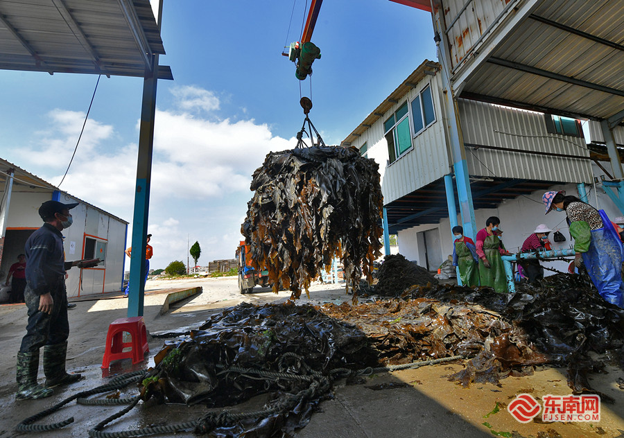 4月14日,在泉州市泉港区鸿兴海藻专业合作社内,工人正在卸下刚采收回来的海带。洪坤泽 摄