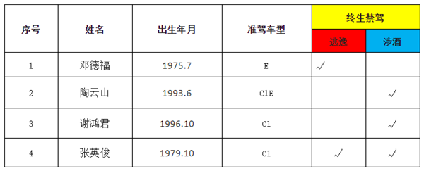 名单曝光 近日,泉州市公安局交警支队向社会公布2022年4月被吊销机动车驾驶证且终生禁驾的4名驾驶人名单。其中2名驾驶人因涉酒驾驶机动车发生交通事故,构成犯罪被终生禁驾;1名驾驶员因交通肇事后逃逸,构成犯罪被终生禁驾;1名驾驶员因涉酒驾驶且在交通肇事后逃逸,构成犯罪被终生禁驾。 典型案例曝光