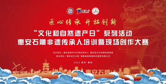 今年6月11日是我国的“文化和自然遗产日”。为喜迎二十大,进一步推动我县国家级非遗项目惠安石雕的保护与传承,提升惠安石雕专业技术人才技艺水平,增强传承活力,弘扬中华优秀传统文化,惠安县文旅局将举办“强国复兴有我”群众性主题宣传教育活动—— “匠心传承 开拓创新”惠安石雕非遗传承人培训暨现场创作大赛。 培训时间:2022年6月6日—6月11日,共6天。 培训地点:福建省振昌园林古建筑有限公司 培训对象及名额:惠安石雕从业者,共25名 培训内容: 1.惠安石雕技艺理论知识学习; 2.实操训练; 3.现场创作; 4.作品点评、评比。 大赛奖励: 1.本次现场创作大赛设一等奖1名、奖金6000元,二等奖2名、奖金各3000元,三等奖6名、奖金各1000元,并颁发奖杯。 2.获奖选手将优先推荐参评第二批县级非遗代表性传承人。 报名时间: 即日起至2022年5月26日。 报名联系方式: 惠安县文化馆联系人: 郑慧芬、陈思婷,联系电话:0595- 87382722 福建省振昌园林古建筑有限公司联系人: 张玲玲,联系电话:15280888661 汪冬丽,联系电话:18750605395 其他事项: 1.此次培训统一安排食宿,不收取任何费用; 2.报名材料和工具由选手自备; 3.凡报名参训的学员,视为无条件同意其作品参加主办方举办的一切非盈利性展示活动及相关宣传推介活动; 3.学员创作作品均不退还,给予收藏费1000元; 4.主办方拥有本次培训的最终解释权。 |