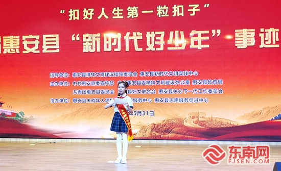 宣读争当“新时代好少年”倡议书。柯碧田 摄 发布会上,来自惠安县第三实验小学的新时代好少年代表王斯瑶向广大青少年发出倡议:要爱党爱国,做复兴中华的好少年。要自信自强,做崇德向善的好少年。要文明实践,做明理增信的好少年。从小立志向、有梦想、爱学习、爱劳动、爱祖国,积极争当“新时代好少年”,努力成长为担当民族复兴大任的时代新人。 惠安县“新时代好少年”推选活动由惠安县委宣传部、县委文明办、县教育局、团县委、县妇联、县关工委等部门依据相关推选办法,通过各地推荐,从中选取典型事迹向社会发布。长期以来,惠安深化“扣好人生第一粒扣子”主题教育实践活动,强化“新时代好少年”选树宣传,号召全县广大未成年人学习身边榜样,响应时代召唤、争当时代新人,努力践行社会主义核心价值观,取得了良好活动效果。 第四届惠安县“新时代好少年”名单 一、学习类 黄韵扬 广海中学初二7班 何梓妍 亮亮中学初一3班 陈沛轩 第五实验小学502班 蒋烨铮 涂寨中心小学601班 肖司丞 溪南实验小学606班 二、才艺类 杨诗瑜 惠安一中初二4班 黄愈芳 科山中学初一1班 陈楚昭 山霞中心小学601班 李思语 崇武潮乐小学602班 李语宸 广海小学605班 三、美德类 万秭孚 惠安一中初二3班 何奕森 辋川中心小学601班 王妍宁 螺城中心小学504班 王斯瑶 第三实验小学606班 四、创新类 张彦橦 城南实验小学502班 赵棋元 八二三实验小学601班 谢唯维 实验小学604班