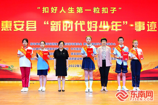 为才艺类“新时代好少年”颁发荣誉证书。王梅馨 摄 东南网6月1日讯(本网记者 林杰 通讯员 柯碧田 许福良)5月31日,第四届惠安县“新时代好少年”发布暨事迹分享会在惠安县新时代文明实践中心举行,现场发布17名优秀青少年的先进事迹。 活动现场,有关部门为新一届新时代好少年颁发荣誉证书。发布会通过播放视频短片、事迹陈列等方式,生动讲述了黄韵扬等17名学生的感人故事。其中,四名学生代表向在场的师生们分享了个人争当新时代好少年的点滴事迹,引发在场观众的阵阵掌声。来自涂寨中心小学601班的学习类学生代表蒋烨铮以《以梦为马,不负韶华》为题,分享他为梦想努力奋斗的成长故事;惠安一中203班的美德类学生代表万秭孚品学兼优,他分享了如何参与公益、践行美德的经历;崇武潮乐实验小学602班的才艺类学生代表李思语才艺双全,她分享了在才艺道路上的精彩历程;城南实验小学502班的创新类学生代表张彦橦热爱科技创新,他分享了一个小小少年始之以爱好,继之以追求,终之以创新的成长故事。 据介绍,这批好少年分为学习类、才艺类、美德类、创新类四个类别,是在全县各地各中小学校广泛开展“争当新时代好少年”学习宣传活动中涌现的先进典型,他们积极践行社会主义核心价值观,在爱党爱国、孝老爱亲、助人为乐、热心公益、勤学善思、创新创造、自强自立、热爱劳动、保护环境、弘扬中华优秀文化,特别在开展志愿服务活动、履行社会责任等方面表现突出,事迹生动感人,为广大未成年人树立可亲可敬可学的榜样。