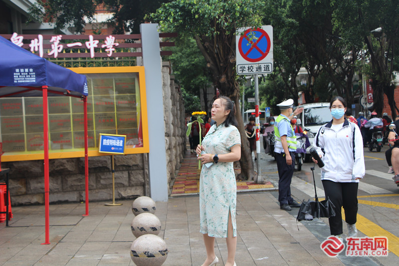 学生家长周女士拿着向日葵目送女儿进入考场。 东南网记者 施远圻 摄