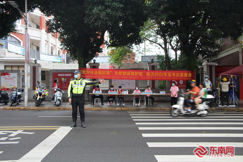 交警在考点外执勤。 东南网记者 施远圻 摄 有保障:考场外的坚实后盾 在泉州市培元中学考点外,记者看到公安、交警等部门执法人员早早到岗,全力护考。“我们在各个路口设置有‘禁鸣喇叭’的标识牌,并派专人在考点周边道路值守,维持交通秩序。”鲤城交警工作人员介绍道。 除了执勤的民警,志愿者也是高考期间考场外的常驻人群。泉州市委文明办、泉州市教育局、鲤城区纪委监委、鲤城区委文明办、福建省公益协会联合开展“‘我为社会做好事’为梦想保驾护航 助力2022年高考志愿服务”,组织志愿者为考生及家长服务。 “我们为考生及家长准备矿泉水、纸巾、雨伞,以备不时之需,希望所有考生能取得好成绩。”泉州微公益协会志愿者刘丽盈告诉记者。泉州市培元中学高二学生潘昕妍报名参加此次志愿服务,她希望能提前感受高考的氛围。 为服务高考考生,泉运实业集团有限公司组织部分出租车参加“高考爱心直通车”送考活动,安排一批对泉州城区路线熟悉、驾驶技术过硬的驾驶员于高考期间为广大考生提供免费接送服务。 “高考这两天我们的车只接送考生,招手即停,考生凭准考证可免费上车。”出租车司机张金聘告诉记者,今天他起了个大早,提前设置空调温度,保持车内恒温舒适,沿着学生经常出现的道路缓慢前行,上午他已从晋江池店镇接送一名考生前往泉州市第九中学考点。