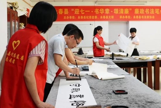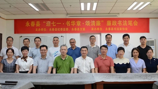 活动结束后合影 近日,永春县纪委监委、县文联、县书法家协会联合举办“迎七一·书华章·颂清廉”廉政主题书法笔会,营造廉洁从政的文化氛围。县委常委、县纪委书记、县监委主任陈雄松,市纪委监委宣传部副部长史晓方到场指导,县纪委监委、县文联等相关领导参加活动。 主办方表示,在这个特殊的日子,我们不能忘记那艘红船,要继往开来,以忠诚为桨,驶往梦想的彼岸。无论何时何地,都不要忘记林间的清风和天边的明月,把党的教诲记在心中。始终保持忠诚、干净、担当的政治本色,始终做党和人民的忠诚卫士。