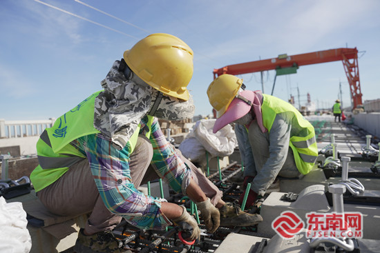 工人们正紧张有序地施工作业。中交二航局 供图 无砟轨道施工质量是确保列车运行安全平稳的关键所在,项目采用的CRTSⅠ型双块式无砟轨道作为长大混凝土结构物,要求一次成型,有精度高、作业衔接性强等特点。为确保海上大跨多联特殊结构桥梁无砟轨道施工精度,项目团队针对海上复杂环境特征,研发并成功应用了跨海多联大跨径桥梁CPIII快速组网方法、用于强风区无砟轨道精调的防风方法、跨海高铁斜拉桥双块式无砟轨道线形控制施工方法。“我们通过原材料和工序的控制,确保了混凝土强度和表面裂缝的防治工作。同时项目团队严格控制施工精度和结构尺寸,引进先进工装,采用自动轨枕分枕平台、自动轨排铺装机及轨排精调机械等智能无砟轨道施工设备,大大提高了无砟轨道施工的精度和质量。”中交二航局福厦铁路项目总工翁方文介绍。 随着泉州湾跨海大桥无砟轨道施工完成,福厦高铁向2023年通车目标又迈进一步。福厦高铁建成通车后,福州、厦门两地将实现“一小时生活圈”,对推动福州、厦漳泉两大都市区加速崛起成为福建发展主引擎,加快海西城市群经济社会发展步伐具有重要意义。 同时,作为京福高铁的重要延伸,福厦高铁建成后将使福建6个市实现“高铁进京”,有效解决中国东南沿海地区铁路“瓶颈”制约问题,对促进福建快速融入全国高速铁路网,发挥沿海高速客运通道具有重要意义。