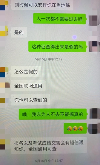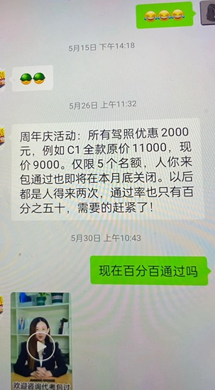 ▲聊天记录 陆女士心动了,但11000元对于她来说,还是一笔不小的开支。就这样,“办证”这个事又被搁置了。 不过,但凡做生意,总会有促销。 5月底,对方发了一则消息称:周年庆活动,所有驾照优惠2000元。这就意味着原价11000元,现在只要9000元。陆某琴心动了,于是向对方提出想要办理机动车驾驶证并按对方要求提供相应材料并缴纳了3000元报名费。