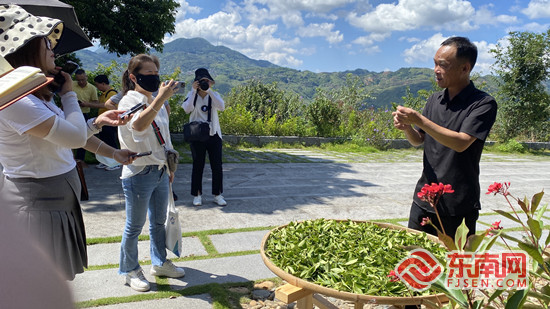 安溪县铁观音制茶大师刘金龙向采访团讲解晒青工艺。林杰 摄