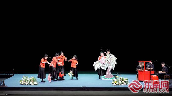 提线木偶戏《闹春》。学校 供图 11人演一台戏 演唱奏乐皆为学生 早在上世纪90年代,泉州市通政中心小学便与泉州木偶剧团共建合作,将国家级非物质文化遗产——泉州提线木偶引入校园。通过课堂教学让学生们了解提线木偶,并成立提线木偶社团让有兴趣的学生学习提线木偶表演。 此次提线木偶戏《闹春》便是由学校提线木偶社团带来的,长达8分钟的小戏从演到唱再到奏乐,仅由11名平均年龄不超过12岁的小学生完成。“以往参加比赛或校外大型表演,学生们最多只能负责演和唱的部分,此次参加比赛的奏乐也由学生负责,对于他们而言这是一个不小的突破。”学校提线木偶社团老师林茵告诉记者。 原来随着提线木偶社团的不断发展,学校已形成完善的梯队培养,在表演中孩子们基本能完成演和唱两部分。为了寻求新突破、让孩子更深入领略传统戏曲的魅力,社团于2020年成立一支小乐队,将提线木偶表演中由幕后演出人员所承担的配乐演奏部分交由学生完成。 今年11岁的林立同学是闽南特色打击乐器压脚鼓的演奏者,表演时他不仅要用鼓槌敲打鼓面,还需将左脚放置鼓面上,通过挪动脚跟控制音色。“这样坐久了,虽然屁股容易酸、脚容易麻,但我不能分心,因为压脚鼓有定音作用,表演时需要注意观察,与台上的木偶进行配合。”林立告诉记者。 “当好‘绿叶’,认真对待排练和演出”是林立给自己的要求,有一次排练时,因为手滑,鼓槌飞了出去。从那以后,他的鼓旁边便多挂了一副鼓槌,以备不时之需。得知《闹春》获得国家级荣誉,他非常自豪。 |