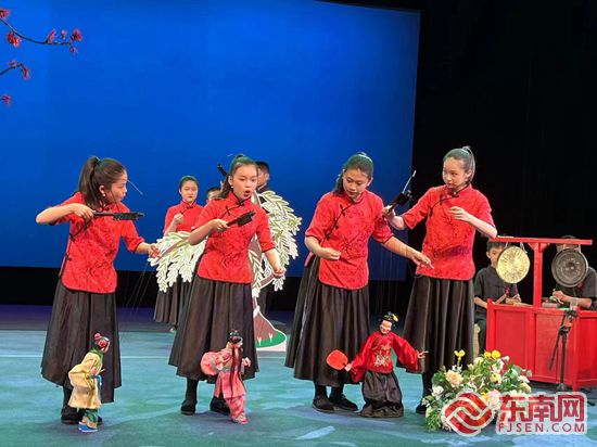 孩子们熟练地操作提线木偶。学校 供图 传承需创新 鼓励师生编排原创剧目 值得一提的是,此次获奖的提线木偶戏《闹春》为学校原创剧目,讲述祖孙三人出外游玩,偶遇一男子爬树折柳的不文明行为,奶奶随即批评那男子,告诫他应注意安全、不要随意攀爬。男子当场道歉,并相约一起蹴鞠、歌舞,呈现出一片平安喜乐的景象,也传递出“讲文明,树新风”的正能量。 “传承,既要延续传统,也要有所创新,我们鼓励有兴趣的学生们参与到提线木偶剧本的撰写及改编中,这样的剧本富有童趣,编排出来才能让更多孩子喜欢。”曾凤蓉介绍道。此外,学校还要求提线木偶社团每学年需编排一出原创剧目。 今年12岁的肖健林是学校提线木偶社团的一员,也是提线木偶戏《闹春》中不讲文明男子的扮演者。“我所操作的提线木偶有30多条线,需要两个人共同操作完成,难度较大。还好剧本符合我们的视角,比较容易理解,在背台词方面不需要花太多时间。”肖健林说。 在小学生涯的最后一年里,肖健林除了想在社团与老师同学们一起排练,学习操作提线木偶外,他也希望能参与到原创剧本的编写中,将来让学弟学妹们排练。 “泉州市通政中心小学的孩子们能获得‘小梅花’奖并不是偶然,而是学校长期以来坚持将提线木偶这项非遗文化引入校园的一个成果。”泉州市木偶剧团、国家二级演员戴勋评价道,作为一名从业者,他很高兴能受邀走进学校教学,推广提线木偶,为这项非遗文化培养后继潜在传承人才及欣赏者。 |