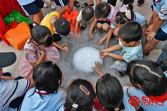 孩子们正在观看干冰升华实验。洪坤泽 摄