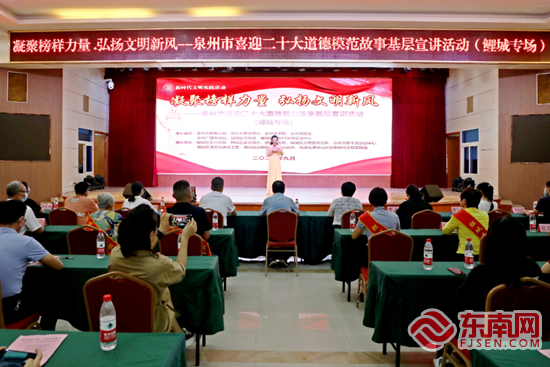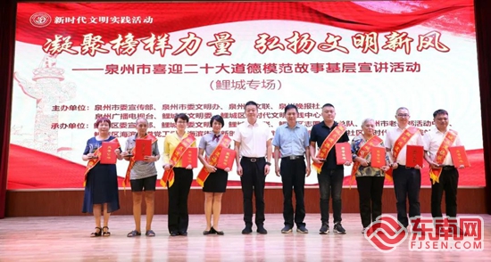 活动现场。李淑媚 摄 东南网9月17日讯(通讯员 李淑媚 本网记者 施远圻)9月16日下午,凝聚榜样力量·弘扬文明新风——泉州市喜迎二十大道德模范故事基层宣讲活动鲤城专场举行。 现场举行鲤城区第七届道德模范颁奖仪式,共有10位道德模范受到表彰。他们中有从军从医30余年初心不变,白衣执甲请命出征武汉抗疫,连续50多个日夜奋战一线,组建战地病房的泉州市第七届道德模范庞素秋;有每天奔走在街巷一线,收集社情民意,热心帮助邻里的党员居民郑卫治;有路遇抢劫挺身而出,弃车狂追三条街,以一己之力制服歹徒的郑周毅……他们虽然来自不同行业,却在不同的岗位上,用自己的实际行动诠释了助人为乐、见义勇为、诚实守信、敬业奉献、孝老爱亲的道德风尚。