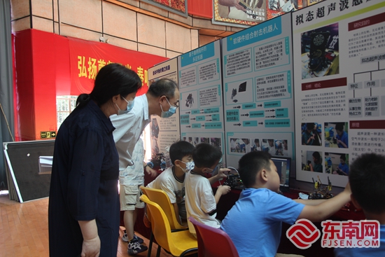 参赛选手向评委展示自己的作品。东南网记者 施远圻 摄 来自丰泽区第三实验小学六年级学生郭思辰带来的参赛作品是口咽拭子采样机器人,该作品使用物联网技术,设计一个集人脸识别、体温测量、数据录入及口咽拭子采集功能的医疗辅助型机器人。“炎炎夏日,我看到医护人员们穿着防护服给我们做核酸采样,汗流浃背,感觉非常辛苦,所以我当时想设计一款机器人,希望能帮助他们提高核酸采样效率。”郭思辰告诉记者。 泉州市第七中学初一年级的陈彦希同学带来的参赛作品基于声光转换的声波可视化探究仪,做这个设计的灵感是来自物理课上关于对声音现象的探究,他的这个作品使得声波可通过声光转换实现定量测量和可视化观测。“通过参加比赛,有利于培养学生们的创新精神和实践能力,不断提高学生们的科技素质。”该校物理教师杨利告诉记者。