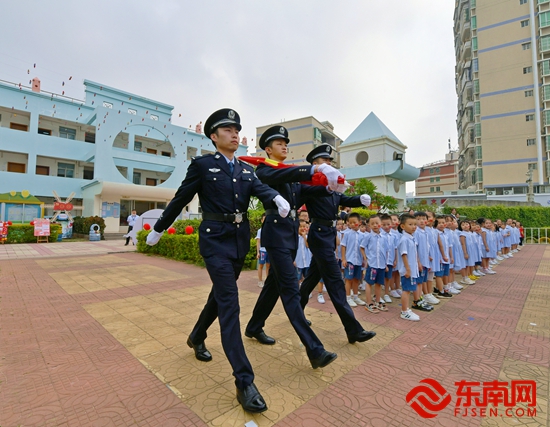 肖厝出入境边检站执勤一队官兵们为全园师幼示范规范的升旗仪式。泉港区 供图