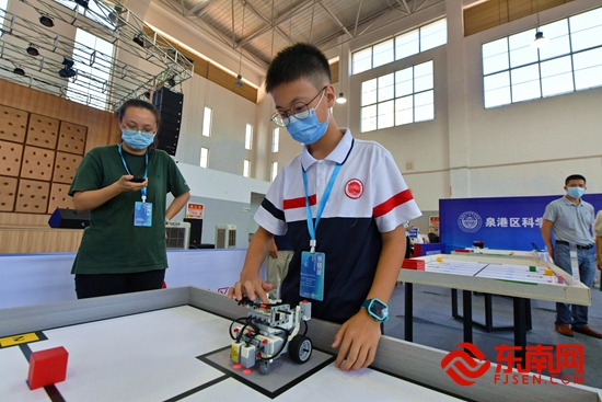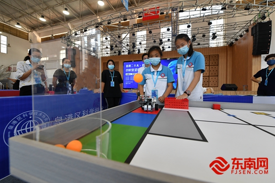 参赛选手正操控机器人进行投篮。泉港区 供图