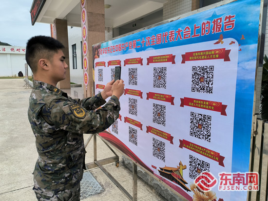 战士正在扫描二维码观看党的二十大相关内容。 武警泉州支队 供图 “我们着力打造战地文化,立足车站、机场等能够体现建设发展成就的重要点位,开展‘巡逻路上看发展成就’畅谈会,并通过战位课堂与流动课堂相结合的方式,学习大会精神,引导大家在战会上思考、在任务中实践,不断深化理解认同精神,鼓舞兵心。”负责机场勤务的晋江中队指导员汤飞宇表示。 走进永春中队,碧绿的大榕树上,一个个鲜红的灯笼高高挂起。为进一步加强大会报告学习理解,该中队将“二十大金句”放进红灯笼里,官兵通过抽签抓灯笼的形式,轮流对金句进行解读。“以做游戏的形式学习二十大精神,不仅有趣好玩,也进一步加深了对大会精神的理解和吸收。”中队战士张文强说道。 旗帜引领方向,道路开启征程。下一步,武警泉州支队战士们将以更加饱满的热情和斗志为实现党在新时期的强军目标、建设世界一流军队作出自己应有的贡献。 |