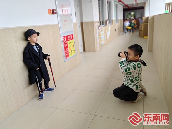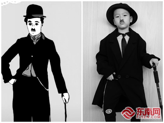 孩子模仿英国喜剧演员卓别林拍照。幼儿园 供图 |