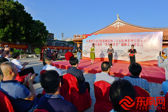 特色节目三句半《金句赞起来》,以耳熟能详的乡音向村民传递党的二十大精神。陈嘉纬 摄 东南网11月21日(本网记者 黄雨昕 通讯员 郭菲凡 林弘梫 陈嘉纬 林茹茵)11月18日,在泉港区后龙镇涂坑村,处处洋溢着学习宣传贯彻党的二十大精神浓厚氛围,一场“福小宣·‘泉’民讲·福传泉港·讲给‘邻’听”学习宣传贯彻党的二十大精神系列宣讲示范活动暨后龙镇“邻里微讲堂”揭牌开课仪式在这里启动。 活动现场,融入泉港“头北”特色的节目三句半《金句赞起来》,以耳熟能详的乡音向村民传递党的二十大精神;“福寿安居”“和谐平安”“乡村振兴”“滨海蓝”“守宝人”5支镇级宣讲小组上台接过授旗,成为泉港区学习宣传贯彻党的二十大精神又一特色宣讲团队;《支部书记讲给“邻”听——党的二十大精神三分钟理论快讲》短视频拍摄活动启动开拍,当地新一届村(居)支部书记将走上理论宣讲台,晾晒比拼,把党的二十大精神讲给党员群众听。 600多年历史的涂坑村,文化底蕴深厚,尤其是27座现存比较好的古大厝雕梁画栋、气派开阔,是村里重要的文物遗产,刘氏百万大厝就是其中保存完好的一座。当天,百万大厝里格外热闹,“欢庆党的二十大,翰墨飘香颂党恩”书画作品展在这里举办,吸引许多村民驻足欣赏学习。“形式很接地气,内容丰富多样,这样的宣讲我爱听!”涂坑村村民刘立和说。 红砖古厝气势恢宏,宣讲活动深入人心。为了把党的二十大精神传递 “厝边头尾”,泉港区还创新利用古大厝作为党的二十大精神基层理论宣讲点,打造“邻里微讲堂”理论宣讲阵地,揭牌成立后龙镇“邻里微讲堂”,把理论宣讲工作搬到邻里,推动党的二十大精神入脑入心、落地生根。