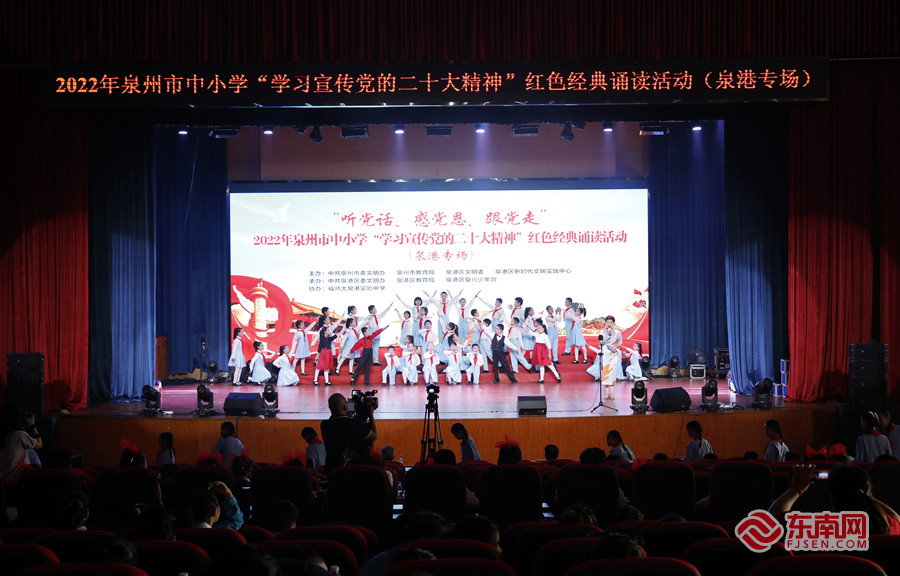 第二实验小学教育集团和星校区诵读《有一首歌》。东南网记者 陈培源 摄 东南网11月21日讯(本网记者 陈培源 通讯员 陈燕燕)近日,2022年泉州市中小学“学习宣传党的二十大精神”红色经典诵读活动(泉港专场)在福师大泉港实验中学报告厅举行。 活动现场,泉港区辖区内13所学校带来精彩演出,朗诵者们饱含深情、富有感染力的朗诵,赢得了现场观众阵阵热烈的掌声。《携手共进 谱写华章》《红船,从南湖起航》《百年风华,盛世如愿》《美丽中国》等经典诵读表演,高潮迭起,无不呈现着阅读带来的力量,更展现了“新时代好少年”新风貌、新姿态。 据了解,此次红色经典诵读活动围绕歌颂党、歌颂祖国、歌颂中国特色社会主义,精选了一批当代红色名篇佳作、经典爱国诗文等作为诵读篇目,通过组织校园晨读、朗诵会、读书会、集中展演等,引导未成年人听党话、感党恩、跟党走。 9月份以来,泉州市委文明办联合市教育局组织全市各中小学、幼儿园开展红色经典诵读竞赛、展演交流等系列活动,引导广大未成年学生践行社会主义核心价值观,传承红色基因,提升道德情操,增进家国情怀。 本次活动由泉州市委文明办、泉州市教育局,泉港区文明委、泉港区新时代文明实践中心主办,泉港区委文明办、泉港区教育局、泉港区复兴少年宫承办,福师大泉港实验中学协办。 |