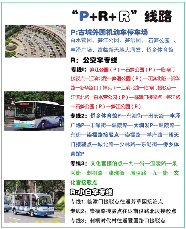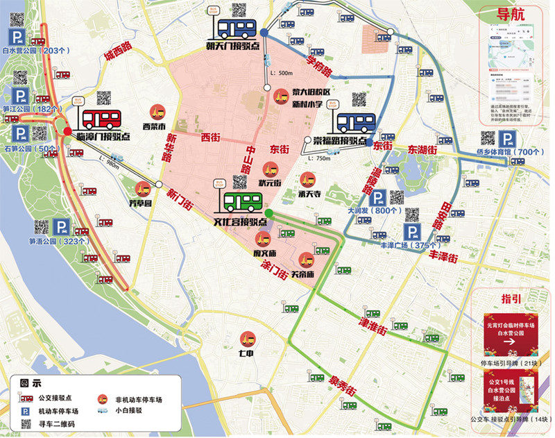 采用“P+R+R”交通模式 鲤城古城区停车资源紧张,加之元宵灯会期间人流、车流剧增,为避免届时古城区内发生严重的交通滞留及人车混行,元宵节期间,将启用多个外围停车场,并增设配套公交接驳专线及小白公交班次。自驾车赏灯出行时请采用“P+R+R”交通模式,将车辆停放在指定外围停车场,到周边换乘点搭乘公交接驳专线,随后换乘小白公交前往核心区。此外,交警部门专门协调高德地图,为群众乘车出行提供便利的停车导航服务。 自驾车市民在泉州辖区内可以通过高德地图搜索“泉州元宵”,轻松定位到7个泉州元宵机动车临时停车场。 出租车、网约车请根据引导牌指示至江滨北路沿线、新车站西门、天都广场、汉唐天下、城西路西贤路交叉口、泉州中旅汽车公司等网约车临时停靠点上下客。骑行电动自行车的游客可以将车辆停放至北门街旧实小校区、芳草园、西菜市场、中山公园、黎明大学(旧校区)、承天禅寺、文化宫、百宜巷、通淮关岳庙西侧、鲤城大厦、泉州影剧院等非机动车停车场。 常规公交和“小白”有调整 元宵赏灯活动期间,将采取“常规线路+接驳专线+小白+小黄人”的方式进行疏运,常规公交线路和古城“小白”均有所调整,同时开通赏灯接驳专线。 1、2、3、4、6、7、8、15、17、19、21、23、24、26、29、30、40、34、42、45、K1、K2、K201、K202、K306、K307、K502、K503、K603、K604、K606、K8、K902、X1等34条公交线路,末班未超过22时30分的均延长运行至22时30分。 古城区域内活动期间每天18时起,所有途经西街西段、新华北路、新门街、涂门街、中山南路、百源路、东街、北门街、爱国路等路段的公交线路将临时改道运行,改道路段途经站点均停靠。东海片区2月4日至5日15时—22时期间,所有途经海星街、滨海街、大兴街、府西路、府东路等路段的公交线路将临时改道运行,改道路段途经站点均停靠。 古城区线“小白”全运力投入,末班延长运行至22时30分。同时,10时至22时期间不进入西街至中山街路段,届时“小白”将根据现场交警指挥适时改道。 慢行系统含“小黄人”和“小橙”,除暂停开元寺场站、泉州钟楼场站、玉犀巷场站、镇雅宫场站等4个“小黄人”及“小橙”场站的借车还车服务外,古城区域内的其他借还车场站均正常提供服务。 为方便市民观赏花灯,泉州公交集团开通3条“小白”接驳专线和3条公交车接驳专线(相关信息见“P+R+R”线路图),运营时间均为18时至23时30分。 花灯看点 ●中山路骑楼花灯 近400盏花灯以传统彩扎灯、针刺灯、刻纸灯为主。 ●府文庙“知止”装置花灯展 以弘一法师书法“知止”为造型,展出100盏花灯,将100位泉州名人名字镌刻花灯之上。 ●花巷“走马灯” 花巷新添的一座八角型“巨型花灯”,通过旋转的LED灯面呈现丰富的乡土文化与世遗泉州的图案。 ●刺桐时代村少儿创意花灯展 近500盏姿态各异的原创花灯尽显花样少年的奇思妙想 ●流动创意花灯车 20部“小白”穿上新装,作为流动创意花灯车参与巡游。 ●微型花车展示 两部“美好生活·四季泉州”微型花车,在古城区域进行定点展示及巡游。 相关链接 大型商业体、文创园 周边管制分流措施 ●丰泽区中央商务区:周边路段实施交通管制,2月4日至2月5日(农历正月十四至十五)每天的15:00—22:00,滨海街(府西路—府东路)南段、府东路(滨海街—大兴街)西段、大兴街(府西路—府东路)、府西路(大兴街—滨海街)东段将进行管控,其间该路段严禁车辆临时停放,仅留应急车道供社会车辆、应急车辆通行,并根据现场实际交通情况实行适时交通管制,管制期间禁止一切车辆通行。 ●少林路刺桐时代村:沿线车辆禁止临时停放;丰泽交警大队现场将根据交通流情况在少林路快速通道下穿匝道口、快速通道往城北路匝道口进行管制,禁止车辆进入少林路刺桐时代村路段通行,引导少林路的一切机动车进入快速通道绕行,禁止快速通道上的车辆下匝道进入少林路、城北路。 ●在江南新区新天城市广场、开元盛世广场、源和 1916、浦西万达广场、城东中骏世界城、东海泰禾广场、领SHOW天地等大型商业体、文创园,交警将指导相关场所管理方完善停车引导标志,设置非机动车停车区,并根据进出车辆情况适时对周边道路进行交通管制与分流。 小贴士 赏灯途中内急怎么办 市民朋友在赏灯途中倘若突然内急,一时找不到公厕怎么办?大家拿起手机,通过“城市公厕云平台”公众号、小程序或APP(均为住建部组织研发),可以进行公厕一键查询,就近解决“方便”问题。 交警提醒 合理安排出行方式 错峰赏灯 请广大市民提前合理安排出行方式,注意观察路面引导标志,自觉服从民警及工作人员的现场指挥,共同维护交通秩序,确保交通安全畅通。请广大驾驶人提前规划并熟悉出行线路,尽量错峰出行,避开交通拥堵路段。 市民外出赏灯一定要注意选择便捷的出行方式:如果路途较近(3公里以内),可考虑步行、搭乘“小白”或者骑公共自行车“小黄人”前往赏灯;如果是路途较远,可考虑搭乘公交车前往赏灯。自驾车赏灯出行时请采用P+R+R交通模式,自觉服从交警指挥,切勿随意停放车辆。(泉州晚报记者 傅恒 陈小芬 通讯员 赵美缘 柯馨 文/图) |