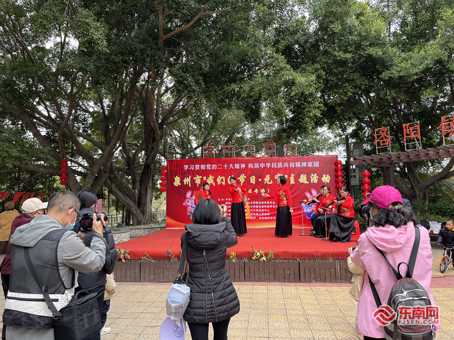 泉州台商投资区专场。骆萍萍 供图 台商区:古风味浓 外国友人来合照 今年,泉州台商投资区专场设置在洛阳古桥上,来自各地的市民、游客身着汉服穿梭于洛阳古桥,熙熙攘攘、热闹非凡,重现千年古桥的繁华。古桥上,来自湖南省的三位游客,第一次来到洛阳桥,身着汉服的他们偶遇外国友人,用相机留下美好的记忆。 而在古桥憩园广场中,《直入花园》《元宵十五》《三千两金》等南音传统曲目轮番上演。曲曲南音优雅抒情,为群众献上一场精彩的视听盛宴。吸引市民、游客驻足围观、聆听,感受着南音的风雅。