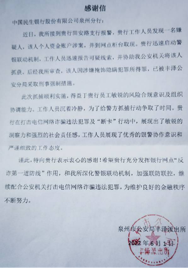中国民生银行泉州分行高度重视电信网络诈骗“资金链”治理工作,通过内部培训宣导、加强警银合作,持续提升网点人员的风险甄别能力和风险化解能力,在做好分支行联动堵截案件、挽回客户经济损失的同时,多次配合公安机关成功抓获涉诈嫌疑人,用高度的责任感筑牢账户风险防火墙。据统计,2022年中国民生银行泉州分行成功堵截异常开户76起,劝阻柜面异常汇款5次、涉及人民币29万元,配合警方抓获涉诈嫌疑人13人,有效提升对不法分子的震慑力,获多地公安部门感谢信。
