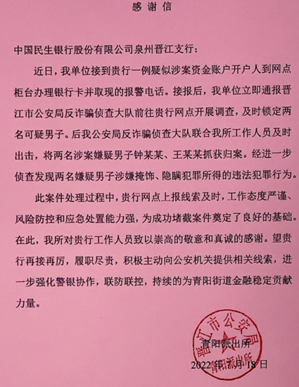 案例三:民生银行晋江支行成功堵截可疑人员开户并配合警方抓获犯罪团伙案例 某日,客户黄某持工作证明到民生银行泉州晋江支行办理个人卡开立业务。当银行工作人员询问到居住地址、办公地址时,客户闪烁其词,表示其目前居住及办公地点都在附近某酒店,因不熟悉环境,无法说出酒店具体地址。该行工作人员进一步询问其居住及办公地点都在酒店的原因,客户支支吾吾无法回答。网点人员经核查发现,客户所持工作证明为“厦门某商务公司”出具,网查该公司存续,但无法核验工作证明印章的真实性,拨打公司电话无人接听。客户户籍地、工作单位均在异地,得知可选择简易开户后,客户表示不在意非柜面出金限额,开卡意愿强烈。银行员工表示,如需开卡需进行上门核实尽调,客户拒绝后慌忙离开。 客户的异常举动引起了该行工作人员的警觉,网点立即启动防控应急方案,组织排查相同工作单位的所有个人银行账户,发现10日内有三名人员持“厦门某商务公司”工作证明在该网点开立个人账户,其中两名人员是宁德福安人,且居住地址均是公寓出租房,但这三人开户时间有所间隔,逐一开户时未表现出异常行为。网点严格遵照个人账户管理相关规定,经事前强化尽职调查无异常后开立账户,并根据账户分级分类要求,审慎设置非柜面出金限额为1000元。账户开立后资金交易存在试探交易、分散转入后柜面取现、快进快出等可疑特征。同时,因非柜面出金额度受限,客户流窜于不同网点取现转移资金的可疑特征最明显,符合电信网络诈骗转移资金的交易特征。经上级行有权人审批,该网点对排查账户采取中止交易的管控措施,并梳理信息整理成涉诈账户可疑线索,报送当地人民银行和反诈中心。接到案件线索后,派出所人员迅速部署抓捕行动,当晚成功抓获4名犯罪嫌疑人。 上述案例中,中国民生银行泉州分行网点工作人员以较高的风险防范意识及敏锐度,及时发现风险、阻断风险,有效堵截了诈骗资金转移。结合当前形势,该行员工提醒广大客户群众:一是不要出租、出借、出售银行结算账户,成为电信网络诈骗的“帮凶”。二是不要轻信来历不明的电话和手机短信,不向陌生人转账汇款,发现被骗要立即向公安机关报案。三是遇到疑似电信诈骗时,不要盲目轻信,要多调查印证。 该行员工表示,在今后的工作中,将继续保持高度的警惕性,不断强化风险识别能力,利用外拓、阵地做好反诈宣传,切实增强客户群众识骗防骗意识和能力。同时,民生银行泉州分行各网点将持续加强与政府部门、监管部门的沟通,持续加强警银协作,共同构筑账户安全防火墙,助力守好客户群众的钱袋子。 |