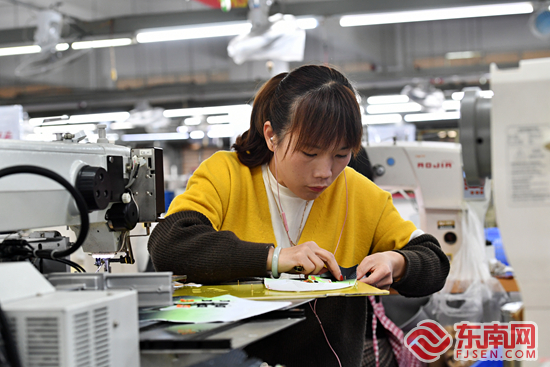 在三晟鞋服有限公司生产车间内,工人正在缝纫鞋服材料。洪坤泽 摄 |