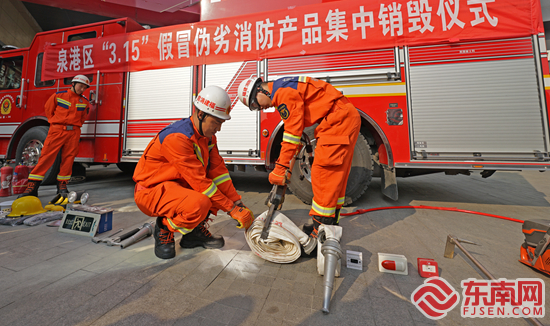 消防员正在对假冒伪劣消防产品进行集中销毁。陈嘉纬 摄