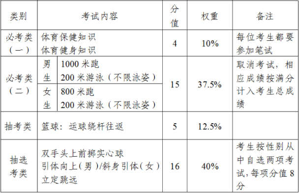 2023年泉州体育中考实施意见出炉 近日,泉州市教育局印发《2023年泉州市初中毕业升学体育与健康考试工作实施意见》,对今年的初中毕业升学体育与健康考试工作进行部署。 取消必考类项目以满分计 今年体育中考考试对象为泉州市2023年所有参加毕业升学(即报考普通高中、中等职业学校)考试的初中毕业生(含应届生、往届生、回原籍考生)。考试报名时间与中招报名同时进行,项目报考后不得更改。 今年参加毕业升学考试的初中毕业生(含应、往届)升学考试中,体育中考总分为40分,其中体育与健康基本知识占4分,身体素质与运动技能占36分。体育与健康基本知识考试共设16小题,每小题0.25分,全部为单项选择题。身体素质与运动技能方面,经综合研判,今年取消必考类1000米跑(男)/800米跑(女)、200米游泳(泳姿不限)项目,相应成绩按满分15分计入学生体育中考成绩。抽考类和抽选考类项目按原公布项目进行(见表格)。 根据中招细则计分办法,每个测试项目按满分100分的评分标准计分,四个项目得分按权重比例相加后,以满分36分折算成身体素质与运动技能测试成绩总分。凡无故缺考的项目,该项目以0分计算。 4月中旬至5月上旬考试 体育中考身体素质与运动技能项目测试时间安排在4月中旬至5月上旬,采取多个考点同时进行的方式,由市教育局统一安排各考点的考试时间(具体时间另行通知)。 在泉州市以外就读的泉州籍应届考生,如需回原籍参加录取,必须到其户口所在县(市、区)教育局招考部门报名,参加统一组织的中考体育考试;往届生的体育考试,到其户口所在县(市、区)教育局招考部门报名,集中在县(市、区)所在地统一进行考试。凡无故缺考,均以0分计算。 体育考试同属中考学科之一,考试不及格者不得补考。 残疾或重症可申请免考 免考的申请对象为:身体残疾,持有残疾证(丧失运动能力)或患有严重疾病(不适合剧烈运动,含因新冠感染引起的重症)的考生。申请材料:身体残疾,持有残疾证(丧失运动能力)的考生:身份证(户口簿)原件及复印件;免考申请表;残疾证原件及复印件。患有严重疾病(不能剧烈运动,含因新冠感染引起的重症)的考生:身份证(户口簿)原件及复印件;免考申请表;二级以上综合医院疾病证明原件;近三年病历原件及复印件、医院检查报告单。免考申请表需经家长、班主任签字,学校初审,各县(市、区)教育局组织医务专业人员统一审核,并在考生所在班级公示三天无异议后,免考申请汇总表加盖教育局公章后,报市教育局备案。 计分方法:免考考生体测成绩按必考类15分加上当年所有参加初中毕业升学体育考试体测考生(不含缺考、免考的考生)的抽考类和抽选考类平均分的80%计算(保留小数点后一位数),体育与健康基本知识理论考试成绩按实际得分计算。 特殊情况可申请缓考 缓考的申请对象:进入考场前因临时伤、病(含女生生理期、因新冠感染“正阳”及处于康复期)不能按时参加初中毕业生升学体育考试的考生,可申请缓考。 申请材料:缓考申请表;伤病考生需要提供二级以上综合医院证明、原始病历及医院检验报告单;女生生理期、新冠感染“正阳”及处于康复期的考生由学校出具证明。缓考申请表需经家长、班主任签字,学校初审,各县(市、区)教育局组织医务专业人员统一审核,并在考生所在班级公示三天无异议后,缓考申请汇总表加盖教育局公章后,报市教育局备案。 在体育考试进行过程中,原则上不得申请缓考,考生中途无故退出视为弃考,缺考项目按0分计算。如考生突发身体异常状况或受伤,确实无法完成考试,可申请缓考。经现场监考老师、医生、主考、监察组确认,考试领导小组审核后,作缓考处理,并填写《缓考申请表》,报当地县(市、区)教育局备案。已考项目按现场实测计分,未考项目以缓考成绩为准,缓考不更改考试项目。 准予缓考的考生只允许一次缓考,原则上由当地县(市、区)教育局组织在当地考点或协调统一集中至就近的后续其它县(市、区)考场参加缓考。在统一考试结束后尚未组织缓考的,由市里统一组织,考试时间安排在5月份进行。 计分方法:在缓考考试过程中,考生因伤病原因无法完成考试,已考项目按现场实测分数计分,未考的项目考生可申请免考,选择免考的项目需经现场监考老师、医生、主考、监察组确认,考试领导小组审核后,作免考处理,免考的项目按以本年度所有参与体育考试的考生该项目平均分的70%计入总分(保留小数点后一位数),体育与健康基本知识理论考试成绩按实际得分计算,并报泉州市教育局备案。(泉州晚报记者曾聪虹) 2023年泉州市初中毕业升学体育与健康考试 测试项目及分值表