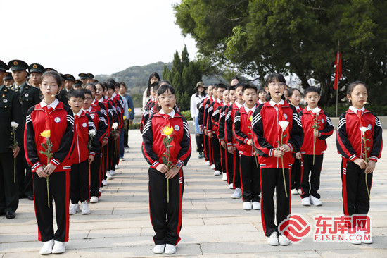 南安市官桥中心小学师生代表手捧鲜花,齐声朗诵《英雄》。东南网记者 陈诗婷 摄