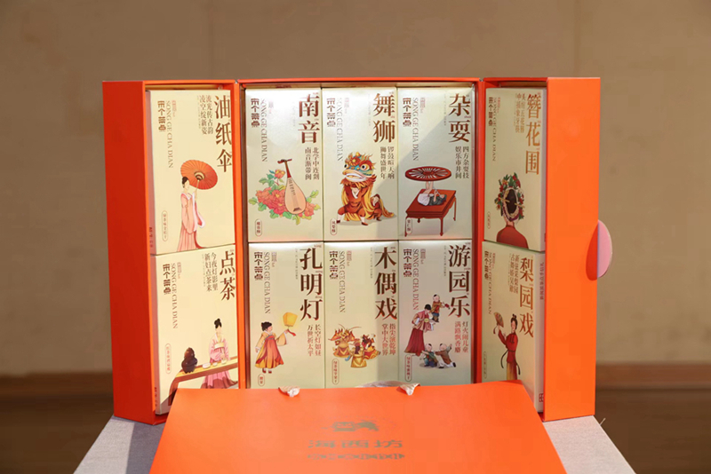 茶点:“我的梦想是当个宫廷剧道具。”(黄梓濠 摄) “采用这种文创包装后产品档次一下子就上去了,原先在泉州老街巷随处可见的小吃点心,现在有点‘吃不起的样子’了。”现场一位参观者用调侃的方式赞叹两款包装设计作品。其中一款名曰《宋个茶点》,分别用簪花围、南音、木偶戏等十种文化元素设计包装凤梨酥、椰蓉酥、苹果干等十种小茶点,整体呈现出宫廷点心般的观感;一款名为《粽有禧狮》,以“开口纳财”、“闭口守财”等文化符号对泉州烧肉粽进行逐个包装,再合并成一套精装礼盒。 |