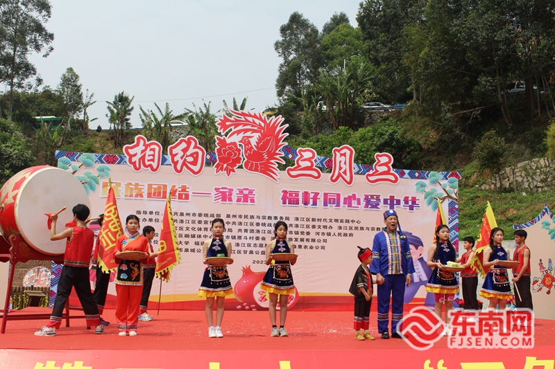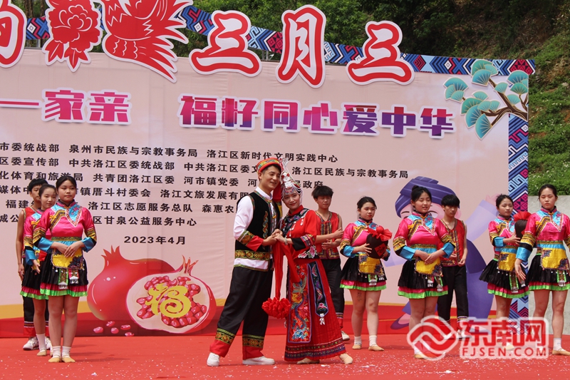 活动现场。 东南网记者 薛逸群 摄 东南网4月23日讯(本网记者 薛逸群)4月22日,洛江区举办“民族团结一家亲 福籽同心爱中华”“三月三”厝斗畲族文化节,当地畲族民众身着特色民族服饰,载歌载舞,喜迎八方宾客。 现场,一支节奏明快、气氛活泼的竹竿舞《畲乡情》拉开活动的序幕。随后,泉州市森惠农业综合开发有限公司、河市镇厝斗村代表进行村企合作“畲寨风情休闲农业文旅”项目签约。项目计划投资5000万元,将充分挖掘厝斗村畲族文化风情及传统民俗、非遗技艺、特色美食等地方优质文旅资源,打造集休闲观光、文化体验、种植采摘、科普研学于一体的农文旅综合体项目。 现场还穿插上演《麦田里的歌声》《畅响青春·魅力畲族》《歌唱三月三》《婚嫁》等极具畲族特色的节目,将活动不断推向高潮。在欢快的气氛下,演员们还走下舞台与在场观众热情互动,一同跳起围围舞和竹竿舞,各方来宾与游客在互动中切身感受畲族文化的多彩魅力。此外,畲族特色市集、露营基地、农家美院推出的各色体验活动也得到了群众的喜爱,或是喝畲茶、品畲酒,或是围炉煮茶,现场欢声笑语不断。