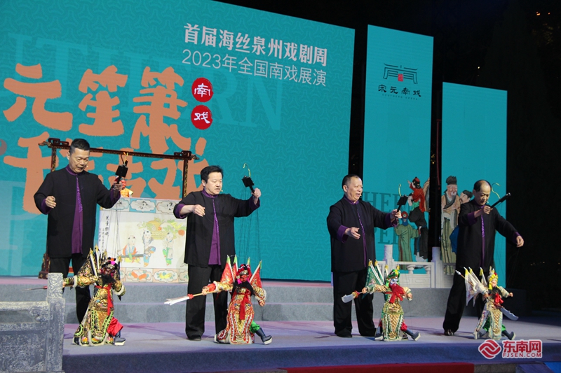 提线木偶戏“相公爷踏棚”开启了开幕式的正式演出。东南网记者 谢玉妹 摄 东南网4月28日讯(本网记者 谢玉妹)一曲曲宋元笙箫,又听古港涛声依旧;一幕幕千年古戏再现刺桐华梦春秋。27日晚,“首届海丝泉州戏剧周——2023年全国南戏展演”在泉州府文庙前广场鸣锣开戏。 当晚,提线木偶戏、南音、莆仙戏、梨园戏、潮剧、弋阳腔、昆剧、湘剧、柳子戏、赣剧、川剧、粤剧、蒲剧、瓯剧、高甲戏、打城戏等16个剧种的艺术家代表与小传承人们大手牵小手,一起登台亮相开幕式,呈现了南戏及古老剧种薪火不息、代代相传的精神风貌。现场设置多个小剧台,8个古剧对棚演出,再现了“前棚嘉礼后棚戏”的宋元泉州繁华夜市景象。同时还举行“刺桐风雅宋”市集、“南戏潮玩”活动,展现浓浓的宋元风情。整场开幕式古朴典雅、异彩纷呈,充分展示了中国戏曲的历史积淀和文化底蕴。 中国南戏发源于宋代,盛行于元明,距今已有上千年的悠久历史,是弥足珍贵的、世界性的非物质文化遗产价值。福建作为戏曲大省,戏曲资源积淀丰厚、传承久远、形态各异,被誉为“中国戏曲文化版图的高地”,现有23个活态地方戏曲剧种,其中18个本土剧种。作为南戏的主要发源地与传播地,泉州戏剧历经千年长盛不衰,形成了斑斓多姿的文化宝库,演绎着古朴生动、细腻典雅的梨园之美,展现着诙谐讨喜、妙趣横生的高甲风采,舞动着指尖艺术、妙手传神的提线木偶,传承着浅唱低吟、韵味深长的悠悠南音,素有“戏曲之乡”“木偶之城”“南音之都”等美称,是名副其实的“闽南戏窝子”。 |