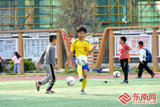 孩子们正在热身,为趣味足球赛做准备。洪坤泽 摄 |