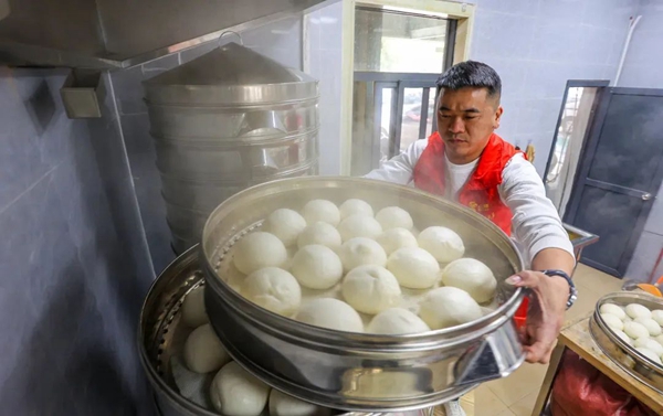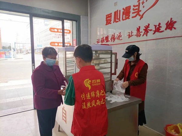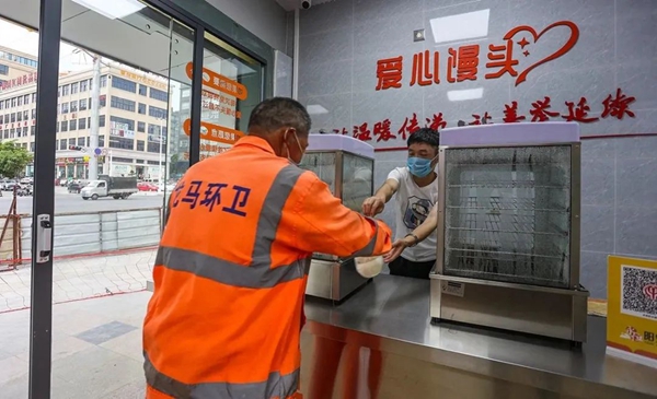 “蒸”爱无价 以“绵薄”之爱,温煦“风雨”之人 一间馒头店、一个馒头对于生活日益富足的人们来说并不起眼,普通的早餐店里,油条、包子、烧麦、麻圆、马蹄酥、花生汤、豆浆……应有尽有,满足了人们日益多样化、精细化的早餐要求。而对于辛苦工作的环卫工人们、停下歇脚的农民工们、生活困难的人们,这家馒头店可谓是快慰人“胃”的好地方。 永恒阳光馒头店的门口竖放着一块醒目的红色字样招牌:本店所有馒头免费送给各种贫困人群,不对外售卖,请谅解!如果您是:生活困难的下岗职工、收入低微的贫寒家庭、正为找工作奔波的毕业生、无助老人……欢迎您来免费食用。