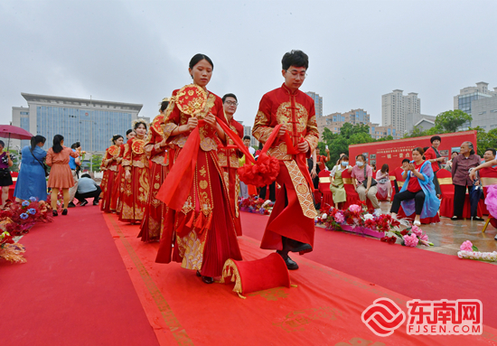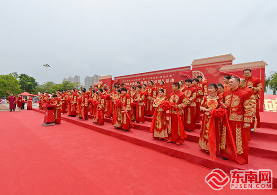 集体婚礼现场。陈嘉纬 摄 东南网5月23日讯(通讯员 陈嘉纬 本网记者 黄雨昕)为破除陈规陋习,倡树文明新风,大力倡导简约节俭、绿色环保、文明健康的婚恋新风尚。日前,泉港区在锦绣广场举办2023年“寿乡福地·山海泉港”青年职工集体婚礼活动,现场35对新人、5对金婚伉俪,身着传统婚服,进行走红地毯、迈火盆、跨马鞍、携手走上婚礼台、行拜堂礼、系红绳、读婚书仪等仪式,在家人、朋友的见证和祝福下,共同携手许下爱的诺言。