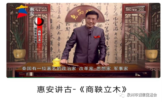 诚信是中华文化的传统美德也是社会主义核心价值观的重要内容之一。为大力弘扬“诚信”文化,营造良好的营商环境,惠安县诚信促进会采取各种形式,加大诚信文化宣传。 近日,惠安县诚信促进会联合县融媒体中心,采用群众喜闻乐见的“讲古”形式,在惠安电视台《惠安讲古》栏目开展“诚信故事”系列宣传播放,邀请中国曲艺协会会员、非遗项目《闽南讲古》福建省代表性传承人、泉州电视台著名讲古人杨江东先生进行演播。节目选取中国古代先贤的诚信故事,在电视台黄金时段进行连续播放。近期已播放《商鞅立木》、《季布一诺千金》、《曾子杀猪》等诚信故事。节目播放后,在观众中引起良好反响。通过“讲古”形式引导广大群众知晓诚信典故、明诚信道理、践行诚信行为,做有信用的人,让“诚信”理念在全县广大人民群众中生根发芽。 |