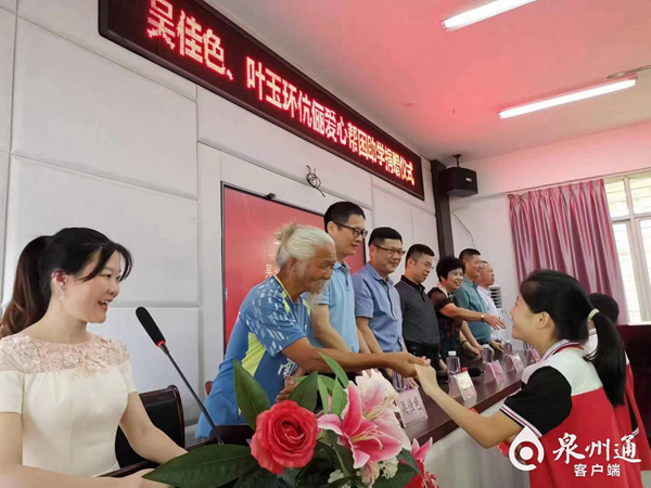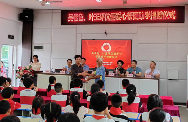 吴佳色(左二)给孩子们送上礼物 “小时候生活很困难,穿的衣服‘新三年旧三年,缝缝补补又三年’,稀粥像白开水一样,被称为‘瞪眼粥’。”吴佳色告诉记者,国家强大,生活富裕了,但是不能忘本。淋过雨的人总想帮别人撑把伞,因此连续多年做公益,这些助学金也是自己平时积攒下来的退休金。“钱虽不多,希望能够抛砖引玉,有更多社会爱心人士来关心、帮助需要帮助的人。只要条件许可,我也会坚持年年捐助家庭困难的学生。” 在南安金淘中心小学举行的捐赠仪式上,他对孩子们说道:“希望你们增强克服困难的信心和勇气,把困难踩在脚底,当作成长路上的垫脚石。愿你们树立远大理想,严格要求自己,远离不良的生活习惯,认真学习,坚持锻炼身体……”当天,他还捐赠了《三字经》《弟子规》《百家姓》等中华经典读物1000本,送给全镇所有小学的一年级学生。