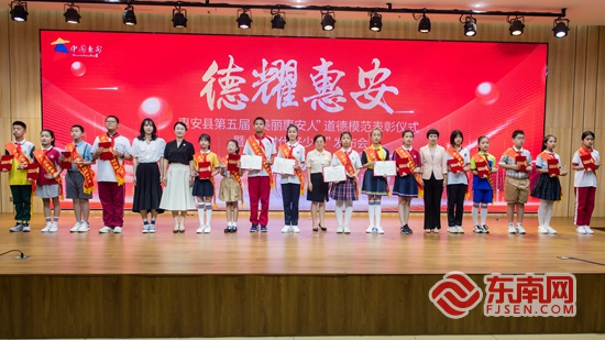 为道德模范颁发荣誉证书和奖杯。邓文祥 摄 东南网5月31日讯(本网记者 林杰 通讯员 柯碧田)31日上午,惠安县第五届“美丽惠安人”道德模范表彰仪式暨第五届“新时代好少年”发布会活动举办。泉州市、惠安县相关部门领导,惠安县的道德模范、身边好人、新时代好少年代表以及各行业、社区群众代表等到场参加,共同见证道德的力量,接受文明的洗礼。 据介绍,“美丽惠安人”道德模范表彰活动从2010年启动至今,已经走过了13个春秋。13年来,先后涌现出道德模范59人、“中国好人”“福建好人”21人,为惠安建设“好人之城”奠定了坚实的基础。新时代好少年评选推荐活动从2019年开始评选,5年来,全县先后涌现出80名好少年。如今,越来越多的“惠安好人”“惠安好少年”,为全社会树立了道德标杆,营造了崇德向善、见贤思齐、德行天下的浓厚氛围。 仪式上,播放了《致敬榜样——惠安因你而美》《成长的路上》宣传片,发布了第五届惠安县“新时代好少年”先进事迹。有关部门领导为16名第五届惠安县“新时代好少年”颁奖,为第五届“美丽惠安人”道德模范及提名奖颁发荣誉证书和奖杯。新时代好少年代表上台作“致敬道德模范,争做新时代好少年”主题发言。活动还安排了童声合唱《最美的瞬间》、小组合唱《文明在哪里》等精彩文艺节目。