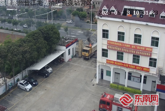 监控可见,着火的火车开车消防站。 晋江消防 供图 东南网6月4日讯(本网记者 陈诗婷 通讯员 黄宏伟 康振兴)今日上午,一辆着火的货车开进晋江市龙湖消防救援站求助。 从监控中看到,车上载有建筑垃圾,车斗处正冒着熊熊烈火,火焰有向车头及车身处蔓延趋势。了解情况后,消防员立即铺设水枪干线架设两把水枪,从左右两边对着火车辆进行出水灭火;五分钟后火势得到控制,消防员利用拉梯上至车斗处,继续对着火处进行出水冷却防止复燃。所幸救援及时,车辆并无大碍。 据司机蒋先生介绍,他从附近工厂运送建筑垃圾出来,路过的几名环卫工人告诉他车上着火了。经查看,当时货车后斗正冒气浓浓黑烟,他急中生智,回想起刚经过消防站,立即上车径直开向消防站求助。 |