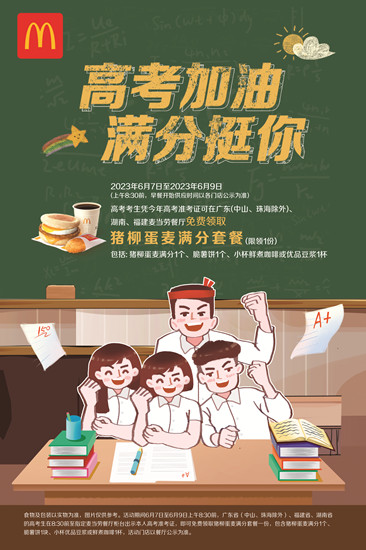 东南网6月7日讯(通讯员 林敏 本网记者 林婕)仲夏时节,高考启幕。今年,麦当劳继续推出“高考加油,满分挺你!”的爱心助考公益品牌活动,并首度在广东(中山珠海除外)、福建和湖南三省超过1600家餐厅同步开展,以麦当劳当家产品“麦满分”力挺考生,助力三省考生以饱满的状态迎接考试,携手更多人为高考学子加油,传递青春力量。 连续三天免费“满分”早餐,为考生加油 记者了解到,6月7日至9日三天高考日早上每天8:30前,考生凭本人高考准考证即可在泉州新华街餐厅(泉州市新华北路开元盛世广场一楼)免费领取猪柳蛋麦满分套餐一份,套餐内包括猪柳蛋麦满分1个、脆薯饼1个和小杯鲜煮咖啡或优品豆浆1杯。麦当劳餐厅还将在柜台为考生开辟“绿色通道”,如考生遇到柜台取餐排队过长等情况时,可随时与餐厅工作人员进行沟通,工作人员将尽快为考生准备。 爱心餐厅护航,为陪考团“减压” 高考期间气温逐渐升高,同时伴有多雨的天气,为了更好地助力高考,麦当劳在考场周边的门店设立了“爱心餐厅”,为陪考的家长和考生们提供一个休息放松的区域,还贴心地为考生和家长提供免费的红茶、扇子等爱心物品,为考生和家长们打造凉爽的心灵港湾。 为向在考场周边全力为考试护航的交警和志愿者们表达敬意,麦当劳还通过“爱心餐厅”为考点附近维持秩序的交警和志愿者们送出“满分”早餐,感谢他们的努力付出。 除此之外,高考期间,顾客还可以通过互动H5,为高考学子送上满分祝福,还能领取麦当劳准备的多项福利,有机会获得麦当劳限定卫衣、代金券等奖品。 |