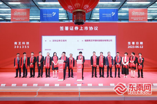 南王科技与深圳证券交易所签署《上市协议书》。全景南王科技 供图 东南网6月12日讯(通讯员 孙瑞红 公金辉)2023年6月12日,福建南王环保科技股份有限公司(以下简称“南王科技”)在深圳证券交易所鸣钟开市,证券简称“南王科技”,股票代码为301355,成为今年惠安首家上市企业也是今年泉州市首家A股上市企业。 泉州市人大常委会副主任赖清正,惠安县委书记王春雷,泉州市地方金融监管局副局长林文革,惠安县委常委、县政府常务副县长蔡旭萌,福建南王环保科技股份有限公司董事长陈凯声等出席深圳证券交易所南王科技上市仪式,共同见证这一历史性时刻。 仪式上,惠安县委书记王春雷代表县委、县政府向南王科技成功上市表示热烈祝贺并致辞。他表示,十二载栉风沐雨,造就了环保纸袋的单项冠军;十二载政企携手,成就了双向奔赴的营商佳话。鹏程万里,未来可期。希望南王科技以上市为新起点,以更加优异的业绩回报投资者、回报全社会。惠安县委、县政府将一如既往地支持南王科技和在惠企业发展,努力提供最优服务、创造最优条件、营造最优环境。真诚期待社会各界有志之士多到惠安考察指导,共创合作商机! 南王科技董事长陈凯声在上市敲钟仪式中表示,今天南王科技的成功上市,不仅意味着公司正式跨入了资本市场的赛道,也为公司的进一步高质量发展注入了澎湃的新动能。上市后,在资本助推和企业内生增长双轮驱动下,南王科技将会取得更大的发展,以优异的经营业绩来回报客户、回报员工、回报股东、回报社会。