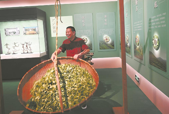 20日,由中国国家博物馆、福建省文物局联合主办的“凤鸣于溪——安溪历史文化展”在北京中国国家博物馆开幕。本次展览共分为“溪水流长”“茶韵香悠”“藤姿铁艺”“民俗乡情”四大单元,系统展示安溪的历史文化、艺术创造和民俗风情。图为乌龙茶制作技艺(铁观音制作技艺)国家级非遗代表性传承人魏月德在展览现场展示制茶技艺。