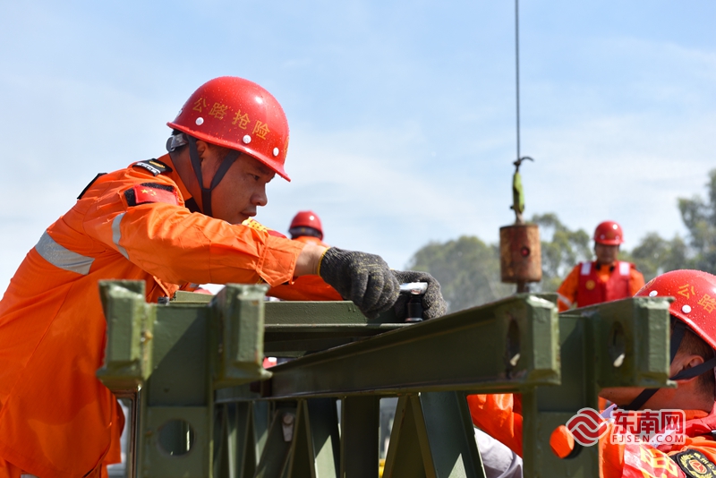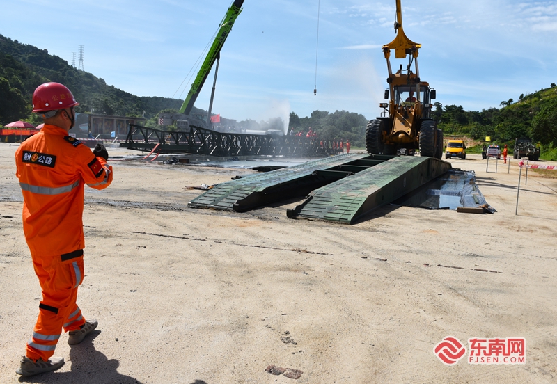 泉州公路防汛演练现场。张卉 摄 东南网7月6日讯(通讯员 张卉 本网记者 谢玉妹)“指挥长同志,公路应急抢险突击队集合完毕,请指示!”“按应急预案执行!”伴随一声令下,由福建省公路事业发展中心、泉州市公路事业发展中心等联合举办的福建省2023年普通公路防汛防台风应急演练正式开始! 本次演练模拟受强台风、暴雨影响,泉州市境内普降暴雨,南安某路段两座公路中桥被洪水冲塌,车辆和行人无法通行。泉州市公路事业发展中心接到灾情讯息后,按照防汛应急预案及时启动应急响应,调集抢险队伍和机械设备,组织各种救援力量奔赴救灾现场。经现场勘察和紧急研讨,一处采取21米机械化桥车快速抢通,为前方灾毁点提供车辆通行和物资运输保障,另一处架设一座跨径为21米单层双排的321型装配式公路钢桥。 在作业人员熟练操控下,机械化桥车8分钟完成架设,一处灾毁点率先完成通车。演练现场另一点,伴随人员指挥声、车辆轰鸣声、钢材碰撞声、榔锤敲击声,将近40名训练有素的公路抢险人员齐心协力、高效配合,头顶烈日、脚踏热浪,满身汗水在阳光下闪耀,衬得橘色抢险服更加醒目,他们全身心投入演练,用奋斗奏响澎湃乐章。 在装载机、吊车的配合下,经过鼻架拼装、主梁拼装、桥梁推进、桥梁落座、引桥安装,321型装配式公路钢桥完成架设,此处灾毁点也顺利恢复公路通行。随着车辆顺利通过钢桥,福建省2023年普通公路防汛防台风应急演练取得圆满成功。 省公路中心副主任王中在点评中指出,此次演练各支队伍通力协作、密切协同、各司其职、快速反应、配合默契、技能精湛,起到了良好示范作用,达到了检验预案、锻炼队伍、提升能力的目的。他强调,公路防汛防台风保安全保畅通工作责任重大,全省各地交通公路部门要深入贯彻习近平总书记关于“两个坚持、三个转变”防灾减灾理念,坚持安全第一,做到强化防汛责任、汛期巡查、抢险训练、路网监测、人员安全,确保2023年汛期普通公路安全畅通。 据了解,泉州市公路事业发展中心历年来高度重视防汛防台工作,每年定期组织抢险队伍进行不少于7天的集训,着力打造了一支急时能战、战而能胜的公路抢险保障队伍;深化上下联动,成立了市级公路中心、路网应急分中心、仓库三级公路应急组织机构,建立了预防与应急准备、监测与预警、应急处置与救援、事后恢复与重建机制;与国有企业、社会救援力量建立友好协作关系,优化泉州公路的应急备用资源。一系列措施有助于提高泉州市公路事业发展中心应对突发事件的快速反应能力和应急处置能力,提升公路部门服务保障水平。