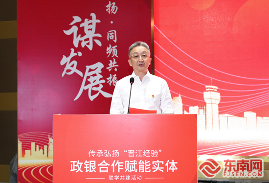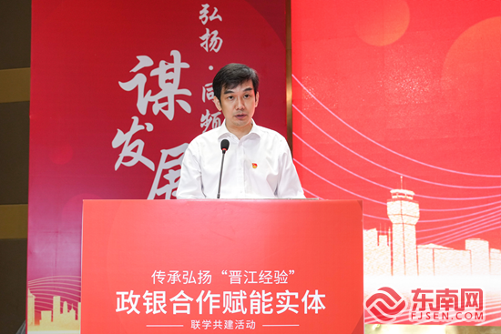 财政部福建监管局党组书记、局长梁勇在传承弘扬“晋江经验”联学共建活动上致辞。银行供图 中国工商银行福建省分行党委书记、行长李强表示,在“晋江经验”的指引下,晋江地方经济取得迅速发展,工行将持续为中国式现代化贡献坚实金融力量。一方面,以现代化金融服务助力现代产业体系建设发展,为晋江优势产业、新兴产业、现代服务业等提供融资投资并举、对公对私结合、境内境外覆盖、本币外币兼顾的综合服务,加快服务创新、丰富金融供给;另一方面,做好“融资、融智、融商”三篇文章,在融资上做“加法”,在让利上做“减法”,建立“工行顾问”团队,从金融专业视角为民营企业当好参谋,帮助民营企业实现资源互助、行业互补;最后,在普惠金融上主动发力,破解小微企业融资难题,努力构建“广覆盖、多层次、高效率、可持续”的普惠金融服务体系。