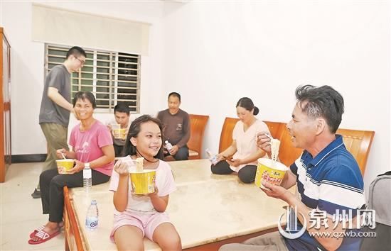 27日晚,几名转移群众在南安市水头镇大盈村一处避灾安置点吃宵夜。 (张九强 摄) 人民至上,生命至上。面对严峻的防汛防台风形势,我市各级各部门迅速行动起来,把保障人民群众生命财产安全放在第一位,提前研判风险,迅速转移危险区域的群众,同时做好转移人员安置和服务管理,严防群众重新返回危险区域。 大事难事见担当,危难时刻显本色。党员干部挺身而出,各方力量纷纷行动起来,汇聚起戮力同心防抗台风的坚强力量。 “到安全的地方去,你的鸡鸭我买了” 基层干部想方设法劝导群众转移安置 “走,到安全的地方去,你的鸡鸭我买了!”昨日,在晋江市龙湖镇福林村,一菜农因担心所养鸡鸭的安全不愿转移,村干部自掏腰包买下12只鸡鸭,顺利让其安心转移。连日来,晋江市各镇街持续做好危险区域群众的转移安置工作。 前晚9时,在呼啸的大风中,租住在东石镇第五社区的陈伦红准备转移。“为了转移他,我们党员干部、网格员可谓‘三顾茅庐’。”第五社区党总支书记蔡天祝介绍,陈伦红住的是砖木结构的老房子,网格员排查时发现其房子存在安全隐患。陈伦红在工地打零工,电话一直打不通。网格员白天走访了两遍,晚上又走访了第三次才找到人。经过动员,陈伦红顺利转移到老乡家安置。 不止第五社区,在东石镇34个村(社区),经过网格化摸排出来的危险区域群众陆续得到转移。 “对于危险区域的群众,除了动员他们找亲友借住,我们还在老人会二楼和学校礼堂设置台风避灾点,供群众临时转移。”东石镇井林村党总支书记许永德介绍,避灾点准备了水、方便面、床、棉被、席子、面包、应急灯、热水壶等物资。