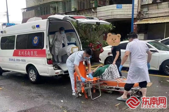 临江街道聚宝新城小区停电,老人需要吸氧,聚宝社区帮老人联系救护车送往医院。鲤城区融媒体中心 供图 |